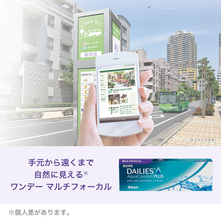 デイリーズ アクア コンフォートプラス マルチフォーカルは、アルコン独自の遠近両用デザインを採用。1枚のレンズに近く~遠くを見るための度数が配置され、手元から遠くまで自然な見え方になるよう設計されています。また、レンズの約70%が水分で構成されているうるおい素材レンズに加え、保存液中に快適成分が2つ配合された「トリプル モイスチャー テクノロジー」により、快適なつけ心地をもたらします。(※)